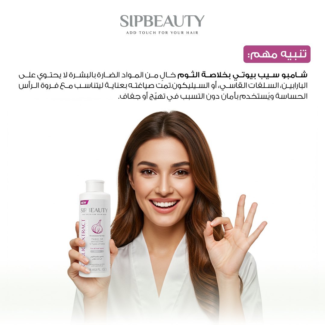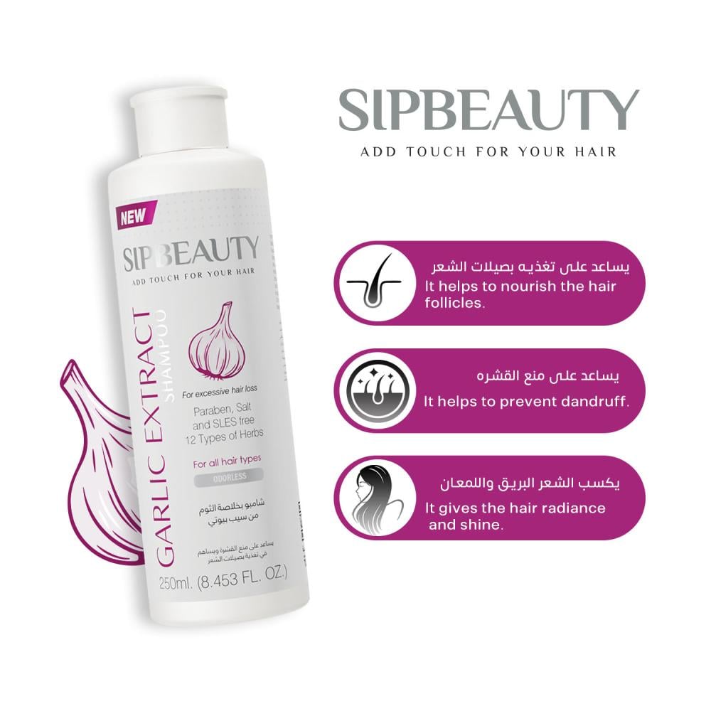 • شامبو سيب بيوتي بخلاصة الثوم يمنحك هذه الفوائد بشكل عملي ولطيف، دون رائحة الثوم القوية، وبنتائج ملحوظة مع الاستخدام المنتظم.