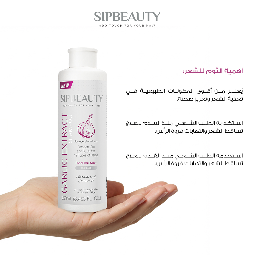 يُعد مستخلص الثوم من المكونات الطبيعية الفعالة في تقوية الشعر وتحسين صحته، لما يحتويه من مركبات الكبريت، الفيتامينات، والمعادن الضرورية لنمو الشعر.