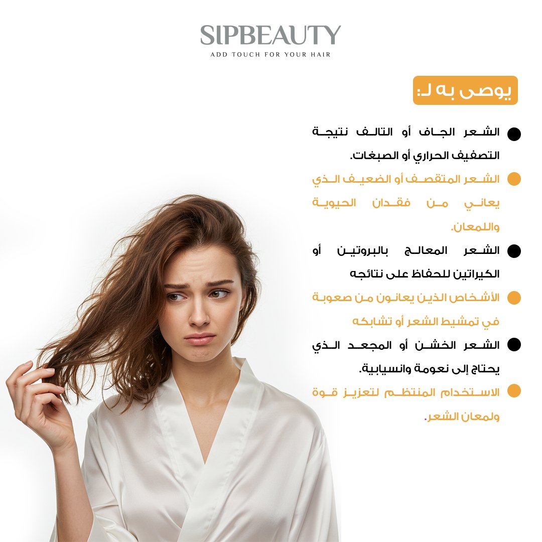تقوية الشعر: يعزز من بنية الشعر ويملأ الفراغات والتشققات داخل الشعرة، مما يمنحها قوة ومتانة.
