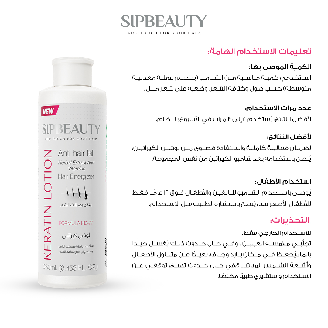 استعيدي قوة وكثافة شعرك مع لوشن سيب بيوتي بالكيراتين، تركيبة متقدمة صُممت خصيصًا للحد من تساقط الشعر وتقوية البصيلات، بفضل مزيج فعّال من الكيراتين المركز ومكونات مغذية تعيد للشعر حيويته من الجذور حتى الأطراف.